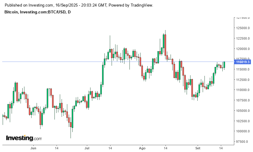O Bitcoin atingiu a marca de US$ 116 mil, impulsionado por um clima de expectativa no mercado financeiro global. A valorização da criptomoeda ocorre em um momento crucial, antecedendo uma importante decisão do Federal Reserve (Fed), o banco central dos Estados Unidos.